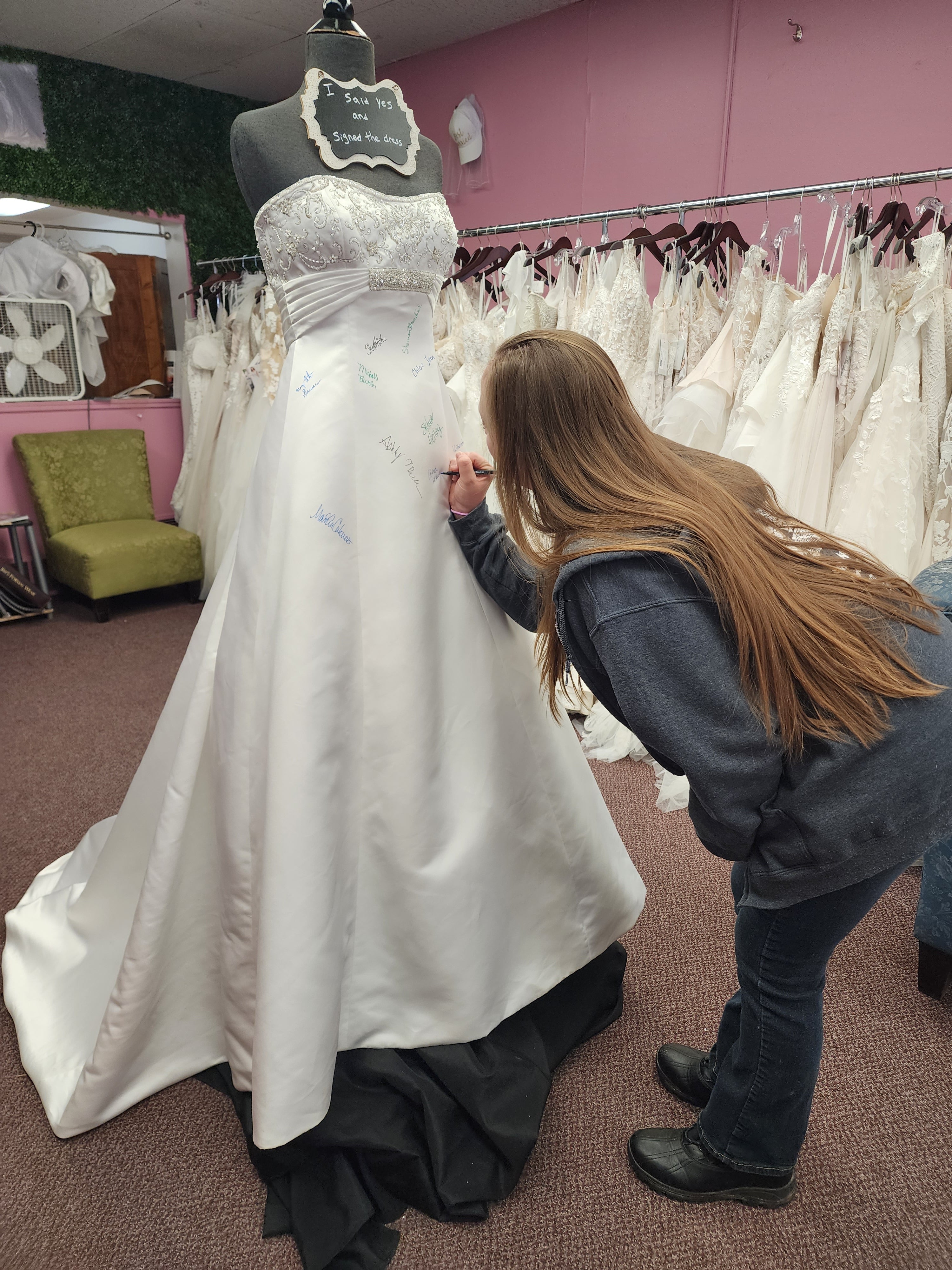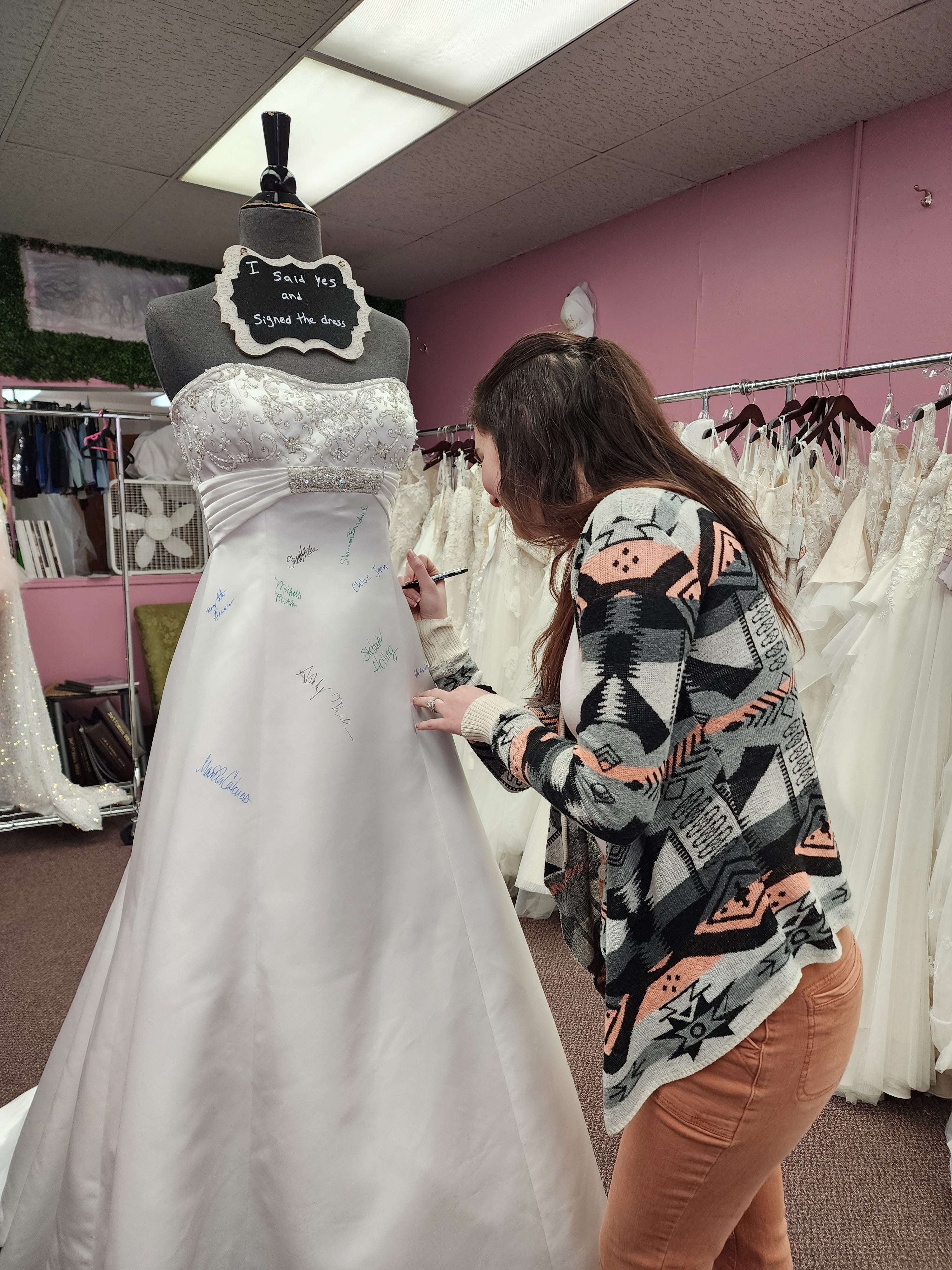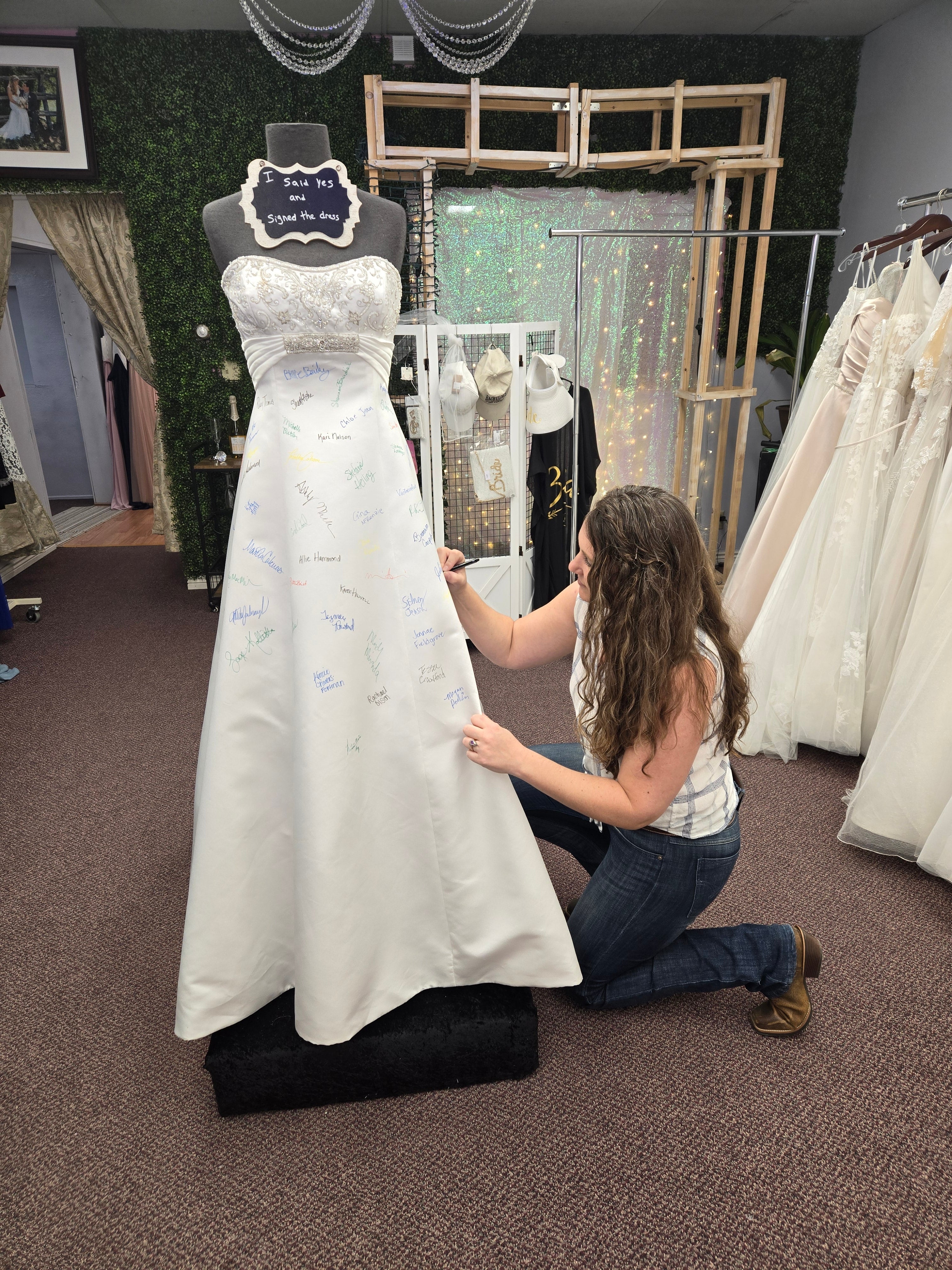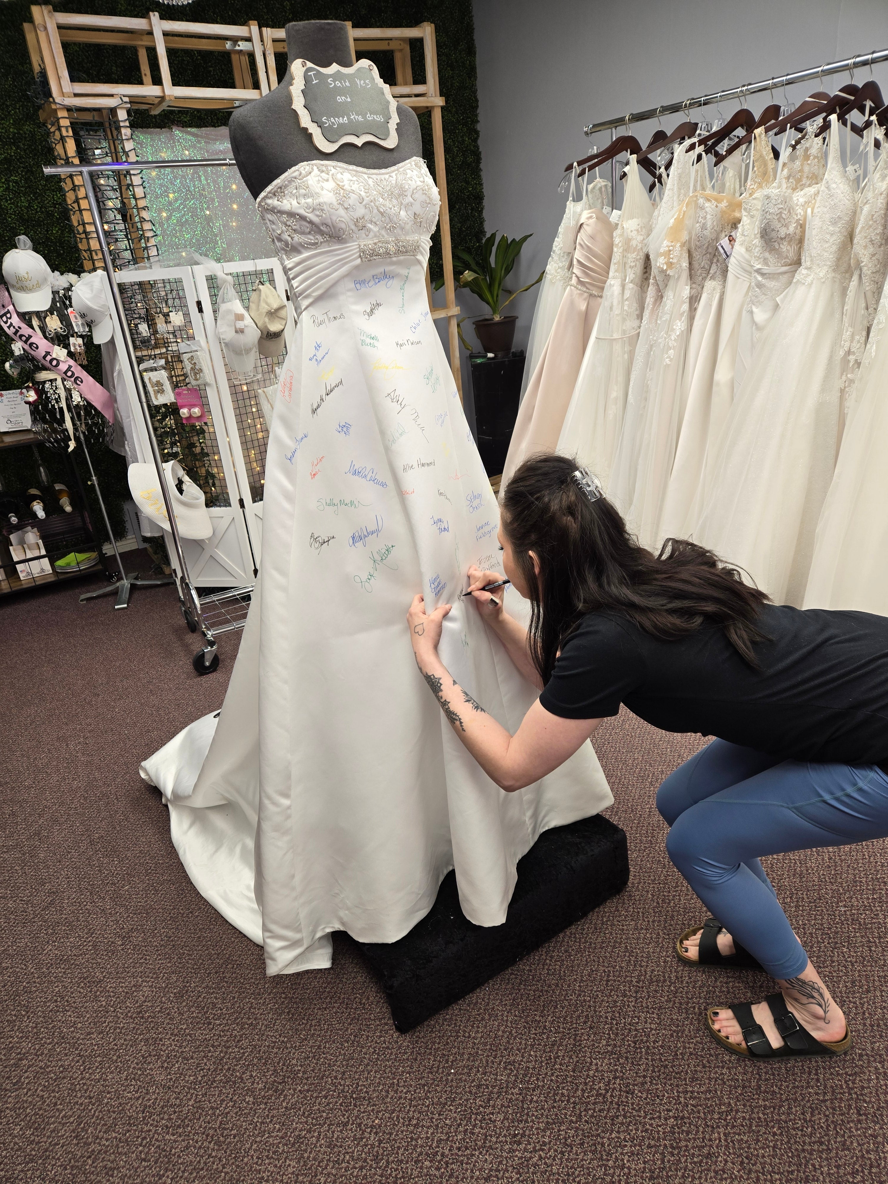 At Once Upon A Story, saying 'Yes' to the dress becomes an unforgettable moment! When a bride finds the one, she gets to leave her mark by signing our iconic bridal dress—a cherished tradition that makes your story part of ours!