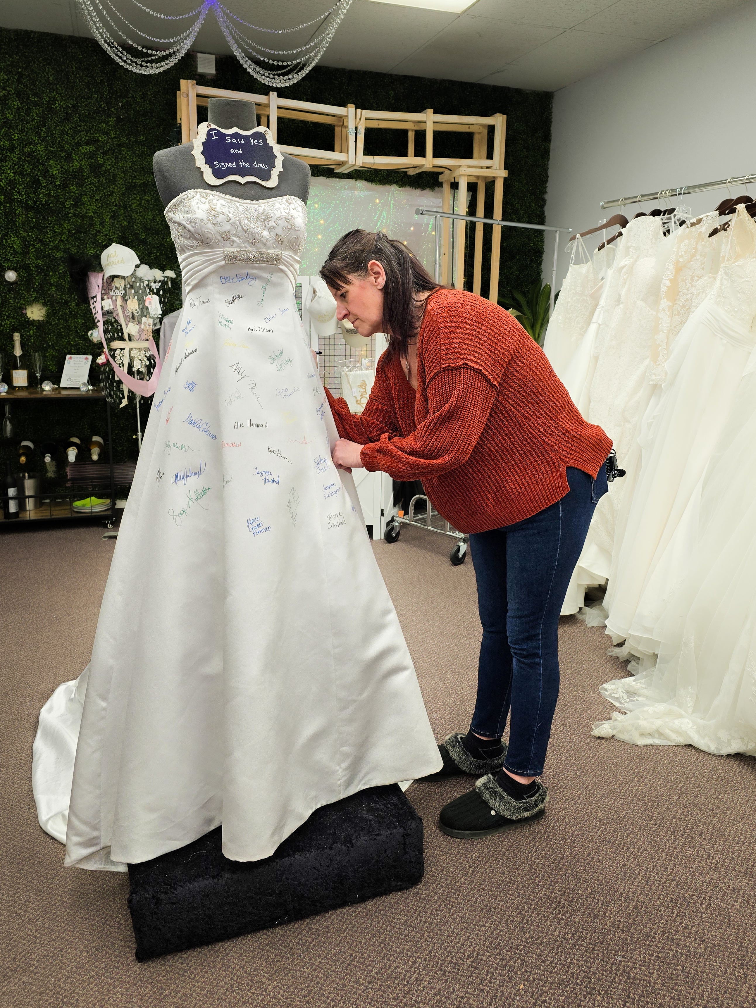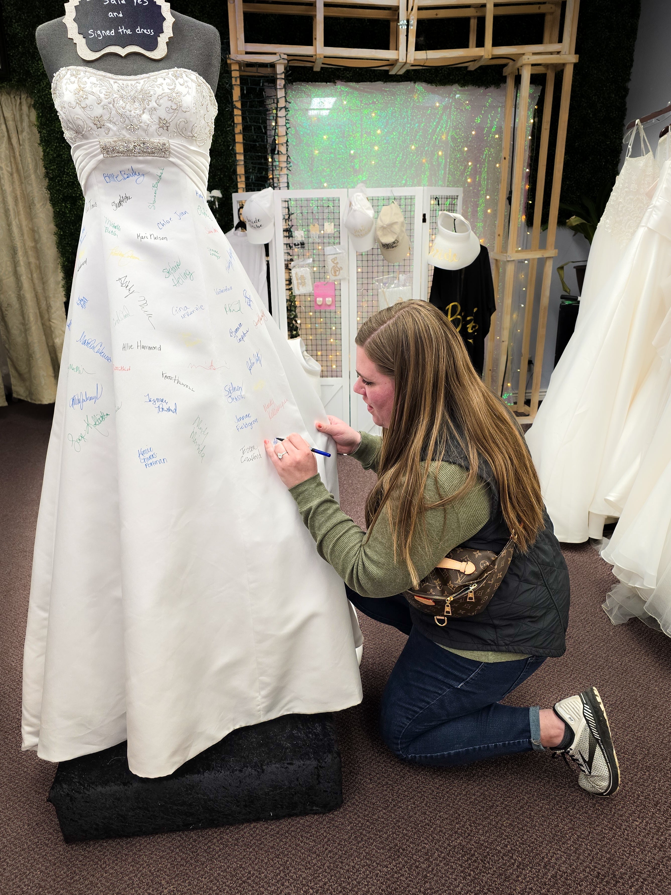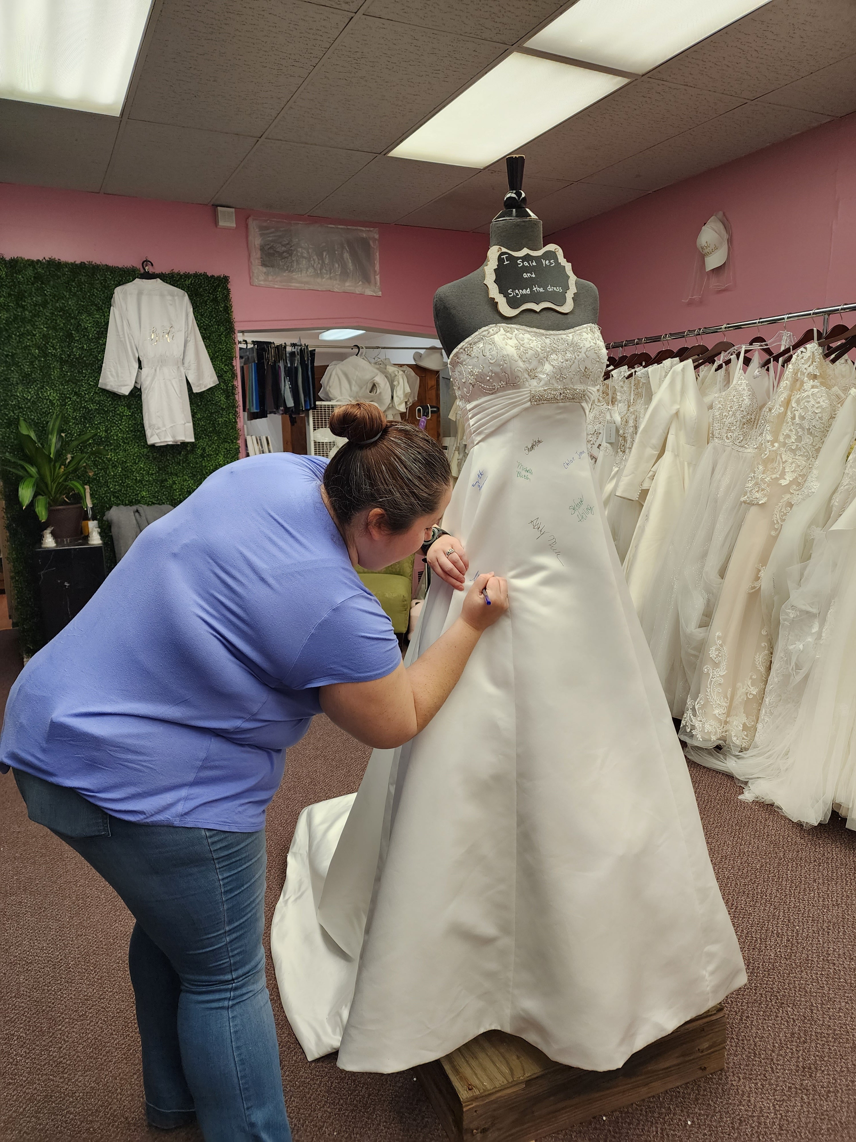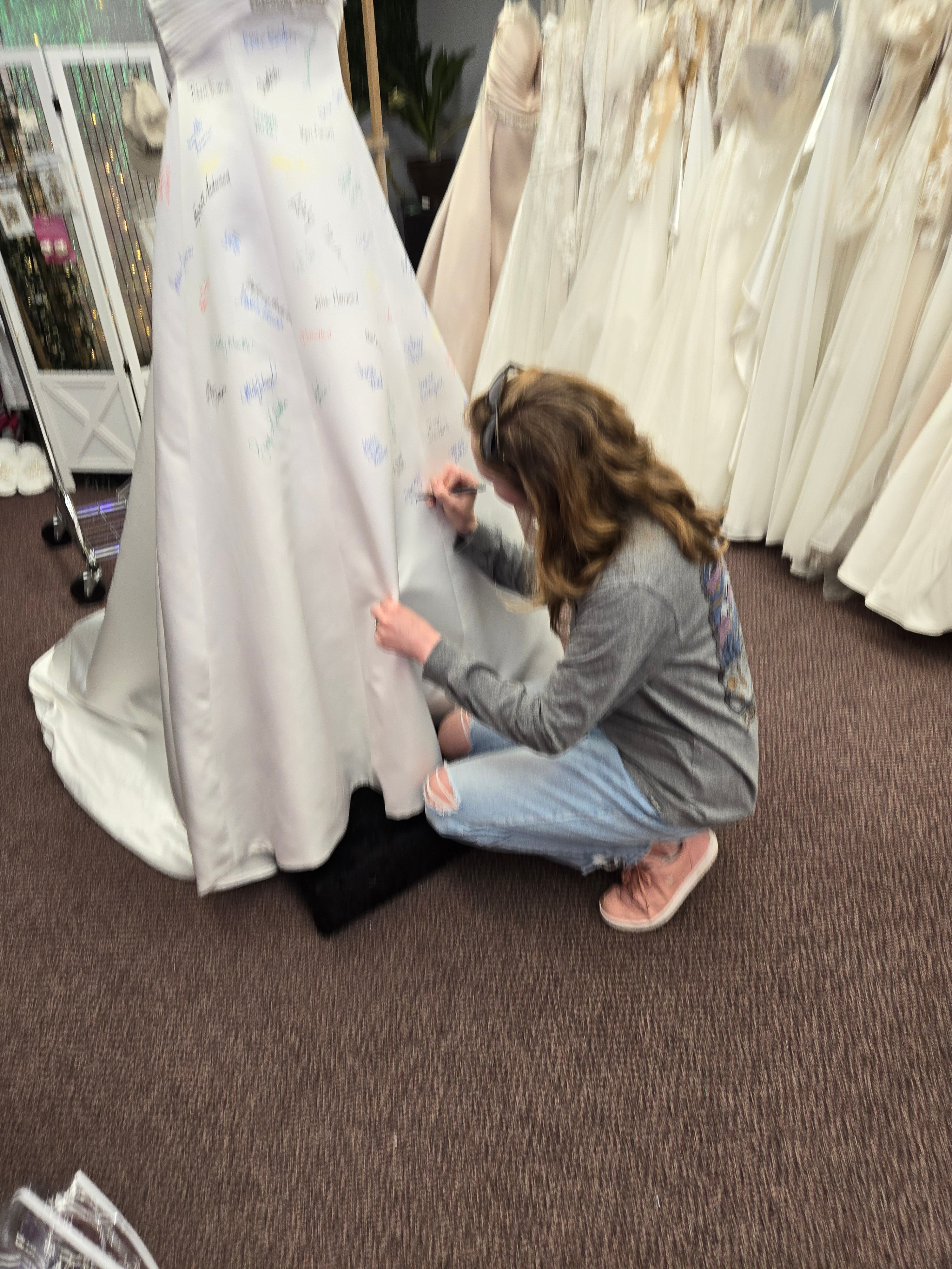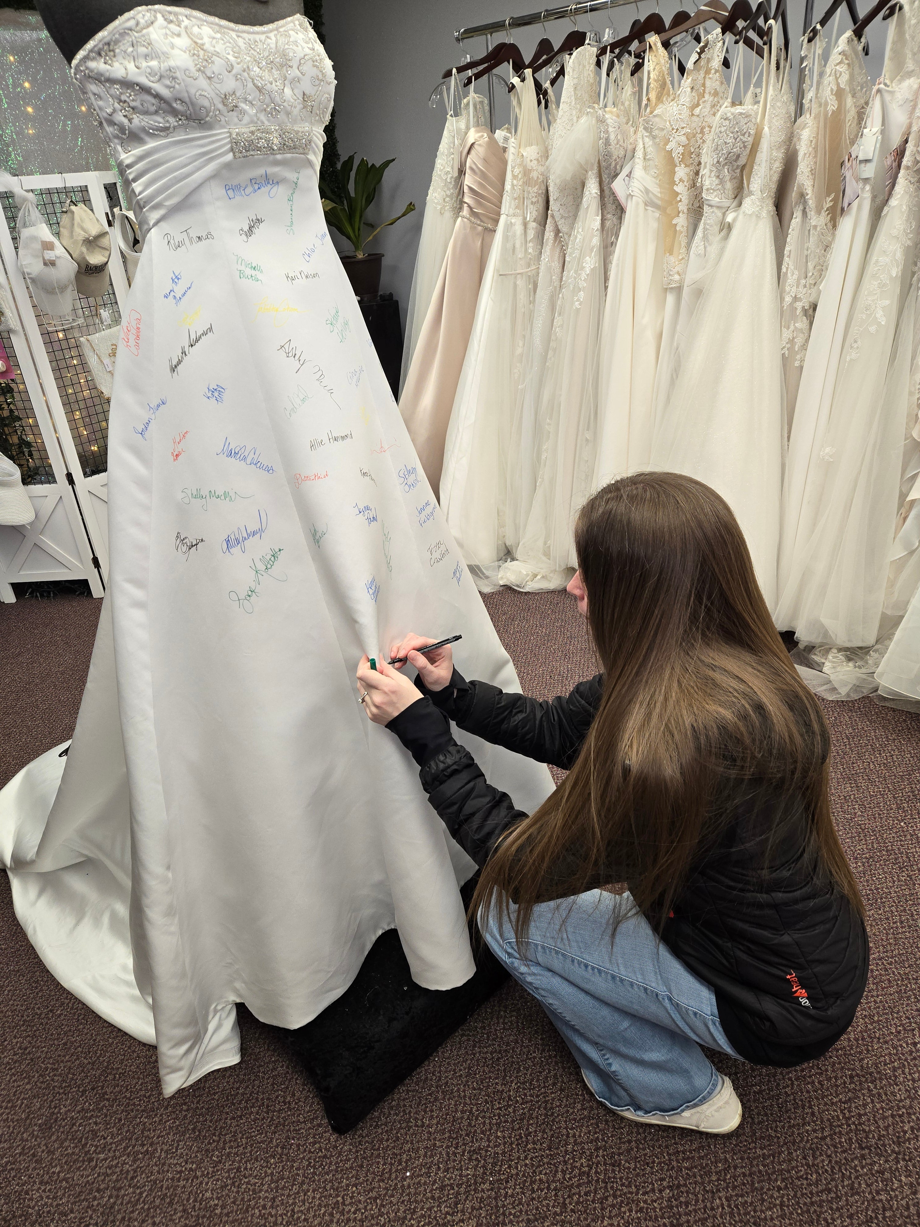 At Once Upon A Story, saying 'Yes' to the dress becomes an unforgettable moment! When a bride finds the one, she gets to leave her mark by signing our iconic bridal dress—a cherished tradition that makes your story part of ours!