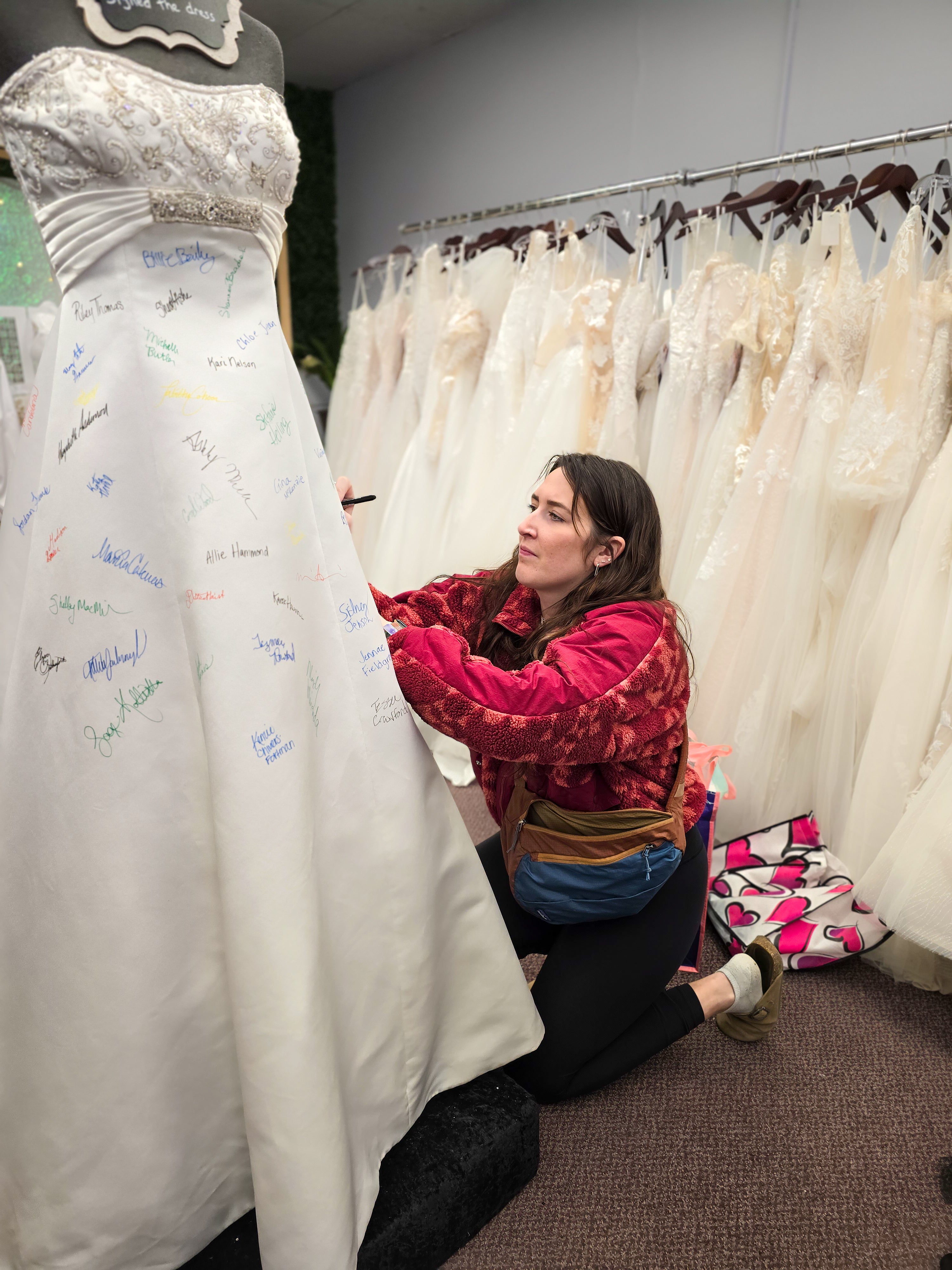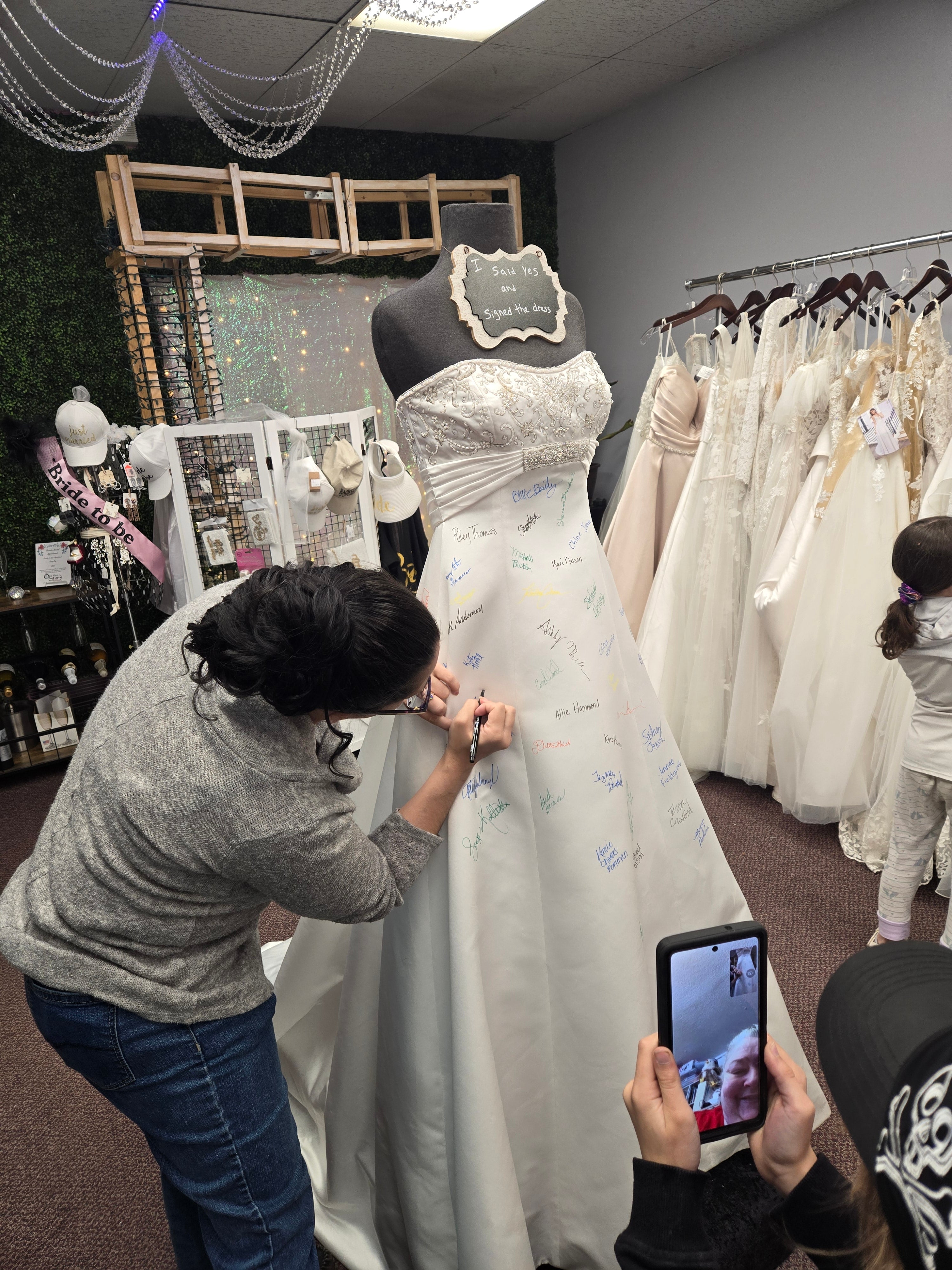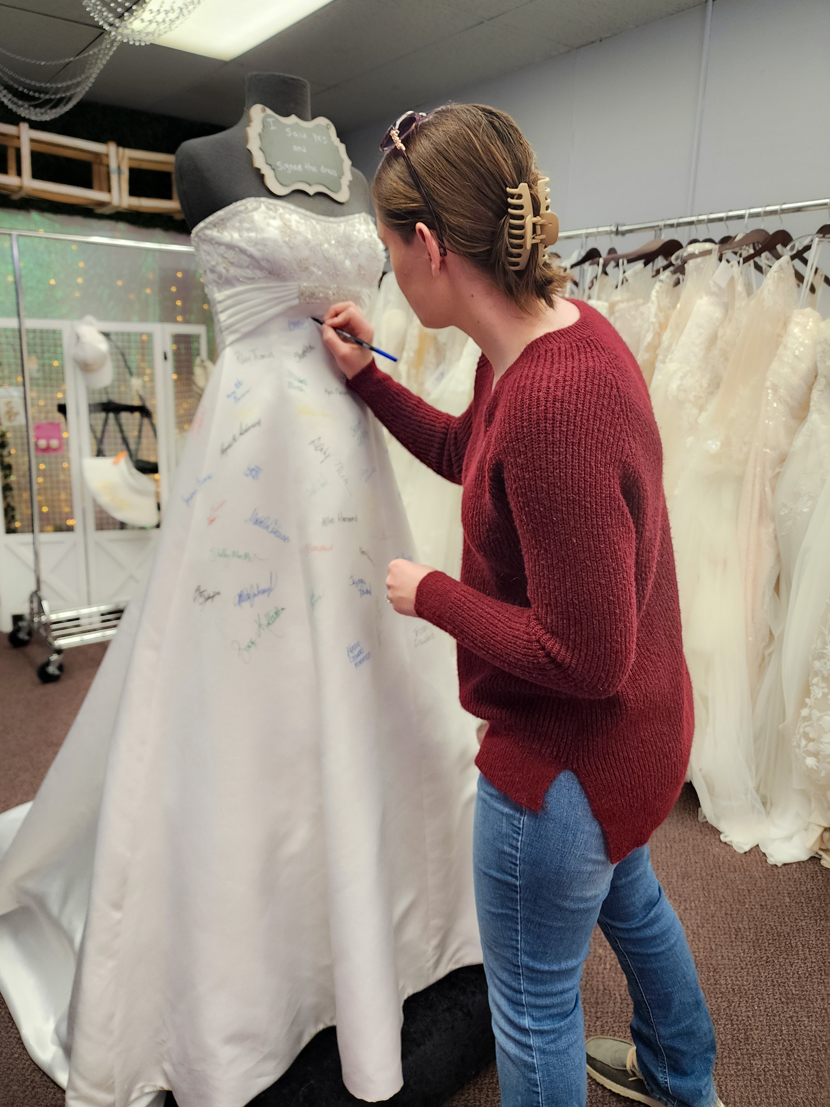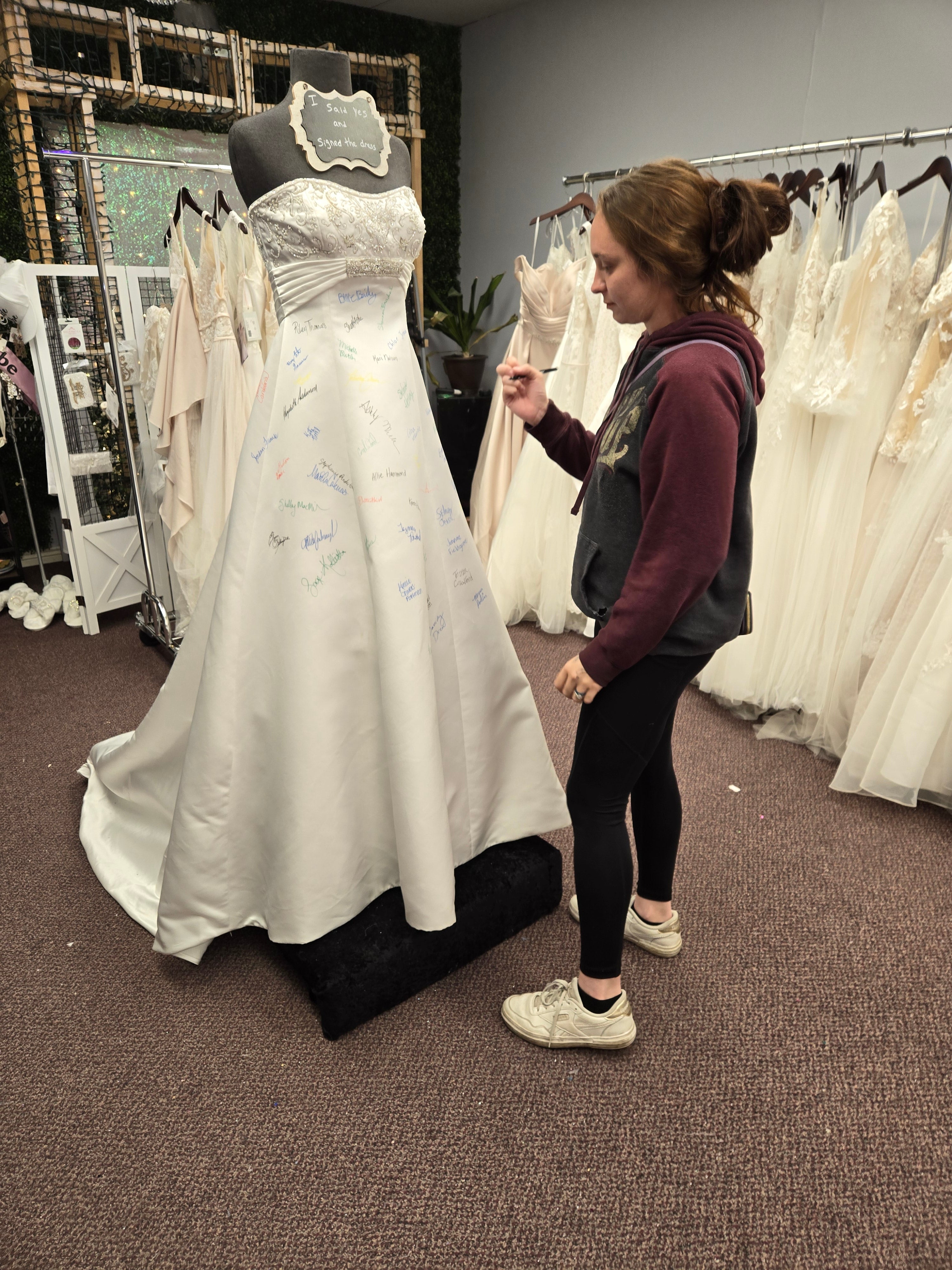 At Once Upon A Story, saying 'Yes' to the dress becomes an unforgettable moment! When a bride finds the one, she gets to leave her mark by signing our iconic bridal dress—a cherished tradition that makes your story part of ours!